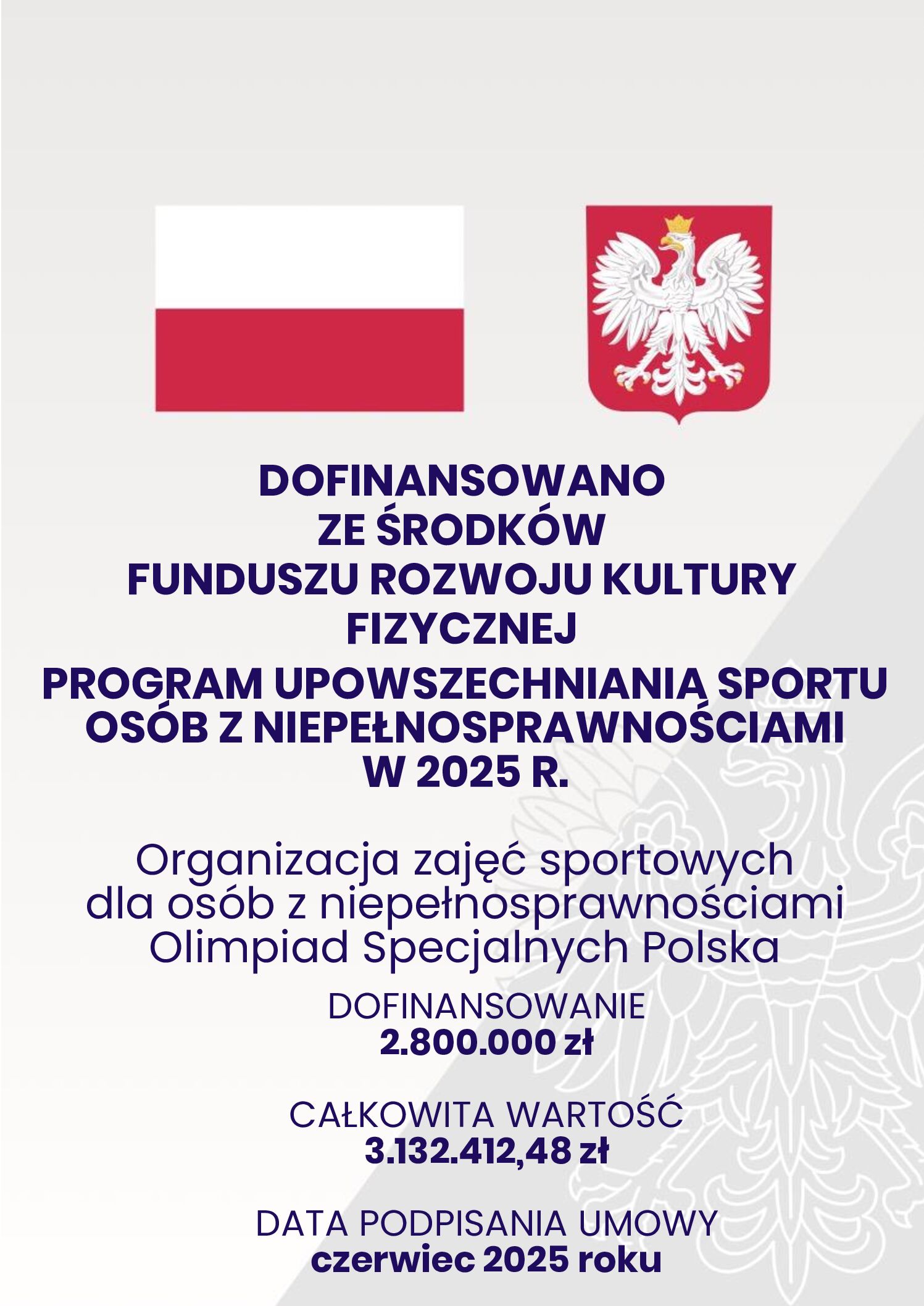 Organizacja zajęć sportowych dla osób z niepełnosprawnościami Olimpiad Specjalnych Polska w 2025 roku – Zadanie realizowane jest przez Oddział Regionalny Dolnośląskie na podstawie umowy nr 2025.0089/0082/SubC/DS-SN/1/KZ, z dnia 5.06.2025 r. Całkowita wartość zadania wynosi 3132412,48 zł. Wartość dofinansowania 2 800 000,00 zł, dofinansowane ze środków Ministerstwa Sportu i Turystyki. Oddział Regionalny Olimpiady Specjalne Polska [...]